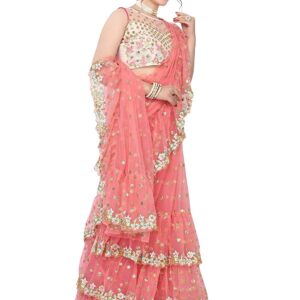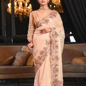 BEATITUDE saree for women with unstitched blouse piece peach premium tissue with embroidery saree