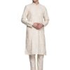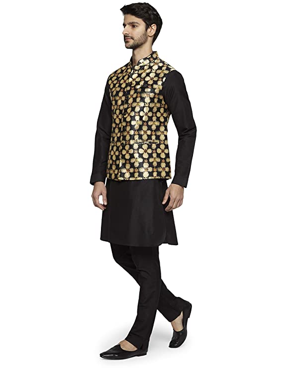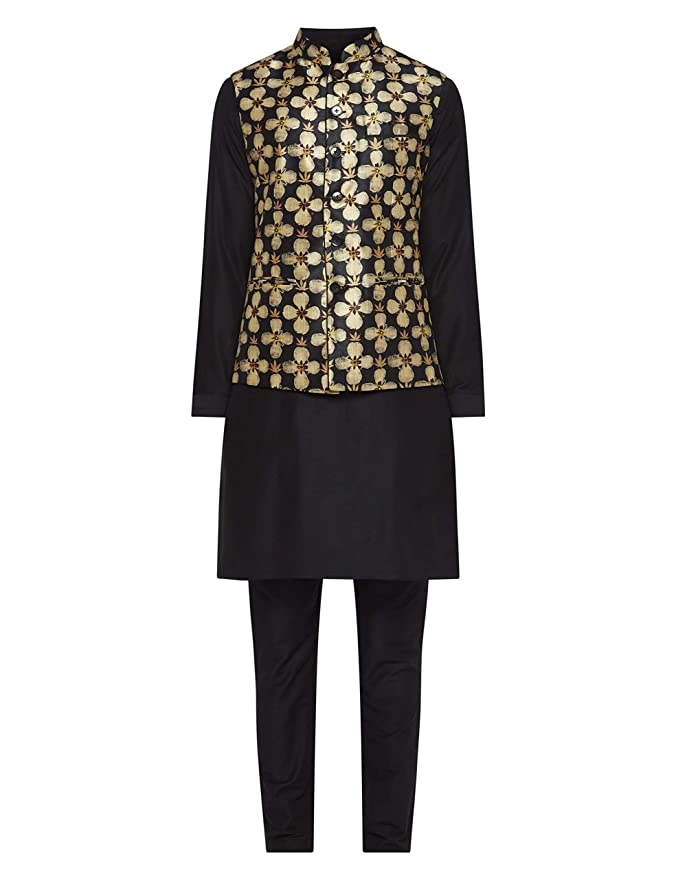 Showcase a graceful ethnic look wearing black colored kurta with bundi and pajama set by Ethnix. This kurta set will fit you like a glove and will keep you comfortable owing to the 100% polyester construction. Be the best dressed man in the room as you adorn this kurta set with a pair of traditional mojaris.