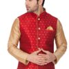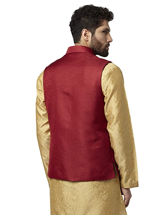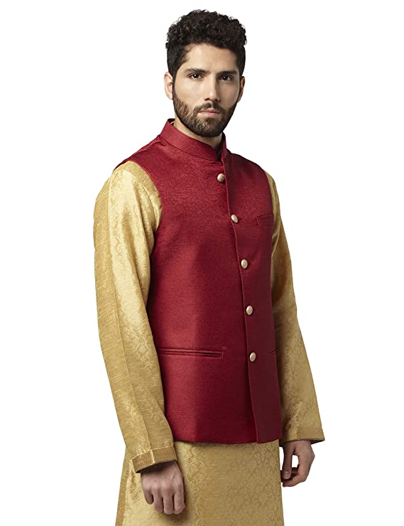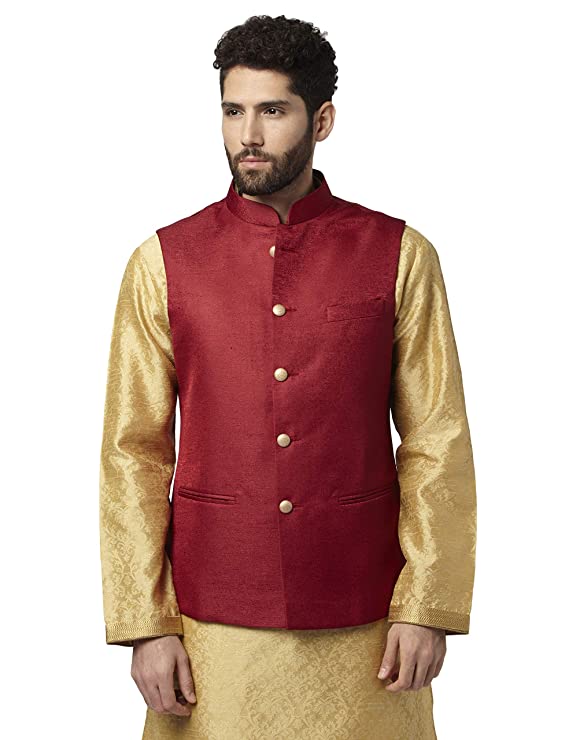 Offering a perfect fusion between an immaculate style with a classic design, this dark red bundi from Ethnix is beautifully designed for the fashion savvy man. Fashioned from a blend of 52% polyester and 48% viscose, this bundi offers an ultra-luxe vibe as well as optimum wearing comfort. This bundi can be teamed with a beige kurta set and a pair of beige ethnic sandals to look your best.