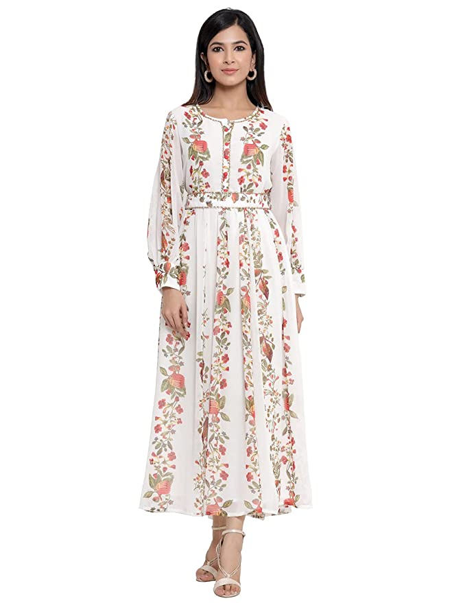 Juniper Offwhite Chiffon Printed Flared Dress with Waist Tie-up