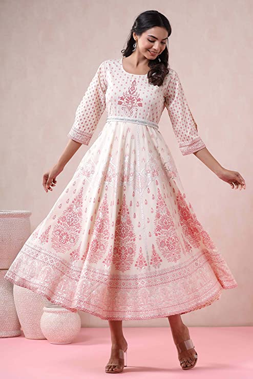 Juniper Women Blue American Crepe Printed Flared Dress with Belt perfect for fusion clothing with a traditional twist, trendy silhouette and latest styles