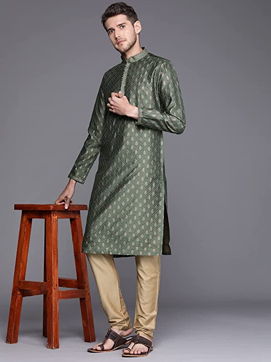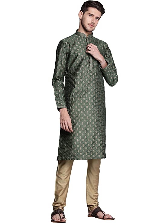 Manyavar Kurta Set for Men, Full Sleeves Mandarin Collar Ethnic Kurta Set for Engagement, Wedding, Party Solid (Green)