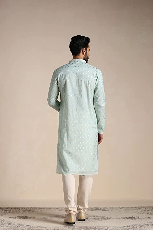 Manyavar Kurta Set for Men, Full Sleeves Mandarin Collar Ethnic Men’s Kurta Set for Engagement, Wedding, Party Chanderi Printed (Pista)