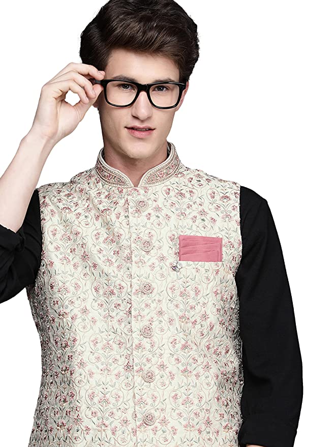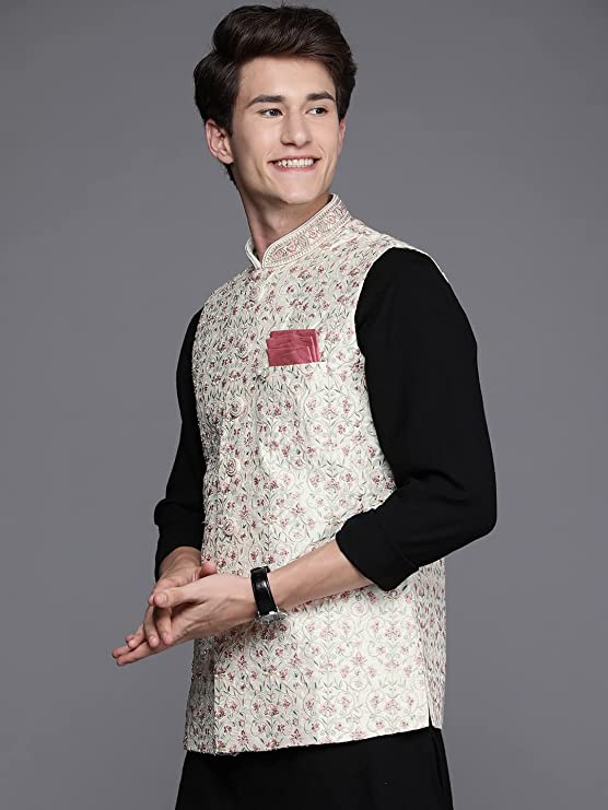 Love contrasts in ethnic outfits? Manyavar brings to you this colour shade jacket that perfectly compliments dark colored kurta set. Try this piece now.