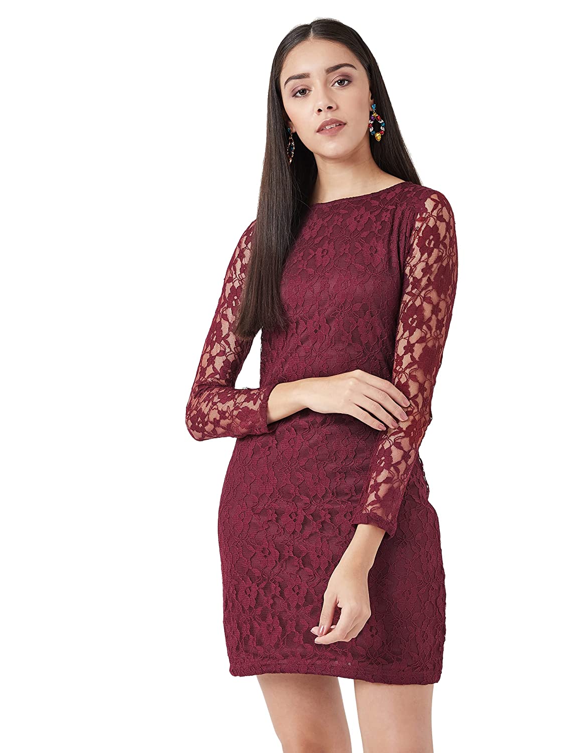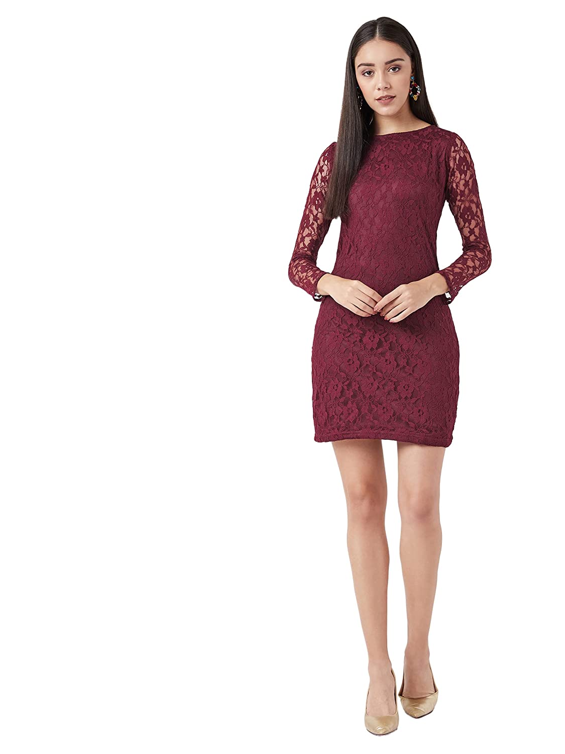 Miss Chase Women’s Maroon Round Neck Full Sleeves Lace Bodycon Mini Dress
