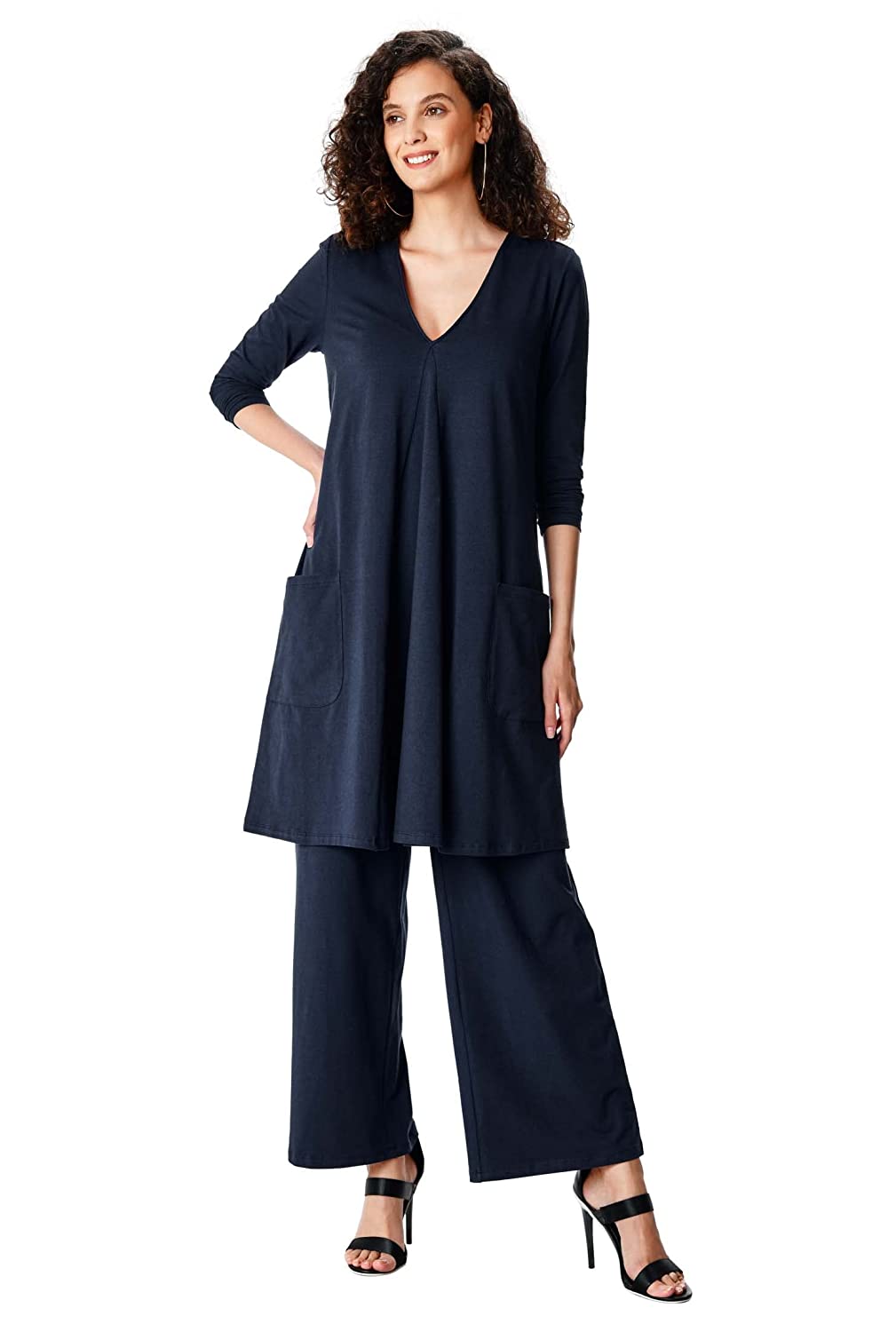 A trapeze hemline enhances the subtly relaxed appeal of our cotton knit long-length tunic coordinated with wide-leg pants for a complete set.TUNIC